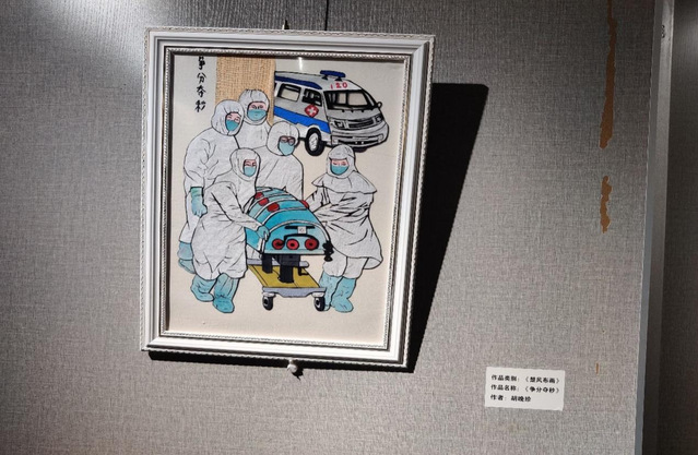 观赏完精美的剪纸作品,接着就是具有湖北特色的《楚风布画》。其中给我印象最深刻的是《争分夺秒》这幅作品。这幅作品展示了在疫情期间,医护人员与新冠肺炎争分夺秒,从病魔手中抢救病人。这是中国众多医护人员抗击疫情的缩影。疫情期间,全国上下同心协力,共抗疫情,风雨压不垮,苦难中开花,疫情并没有把我们打垮。我们各族同胞团结一心,人人都是参与者,人人皆为战斗员,在党的领导下,共同打赢了这场新冠疫情防控攻坚战。