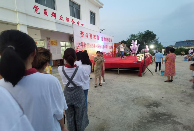 “下面有请来自湖北省武汉市的花朵为我们演唱,大家欢迎。”在台下掌声之中我们上了台,跟随着音乐,看着面前合唱指挥,我们坑坑巴巴地结束了演唱,虽没有气势如虹或整齐划一,但每个人都努力展示歌喉,笑容满面,体会着晚会中热热闹闹的气氛。随后更是有京剧的智取威虎山,饱含热情的舞蹈,激情洋溢的民歌......每个节目都是精心排练,展示着村民对建党100周年的热烈庆祝,也展示着属于他们的吃苦耐劳与活力满满的饱满精神。在这体会着热情,感受着美好,100年风雨兼程,100年漫漫求索,100年卓越辉煌。中国人民从站起来到富起来、强起来的伟大飞跃,本质上就是中国共产党以民为贵、一心为民、坚持初心、砥砺前行的时代壮美画卷。起来、起来、起来,前进、前进、前进,在未来的征程中,中国共产党将坚持不忘初心、继续前进,用为民谋福的一腔热忱创造中华民族更加辉煌灿烂的明天。