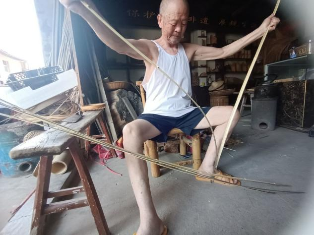 图为非遗传承人陈正和老先生正在破竹,为制作竹编作品准备材料。通讯员朱雅婷摄