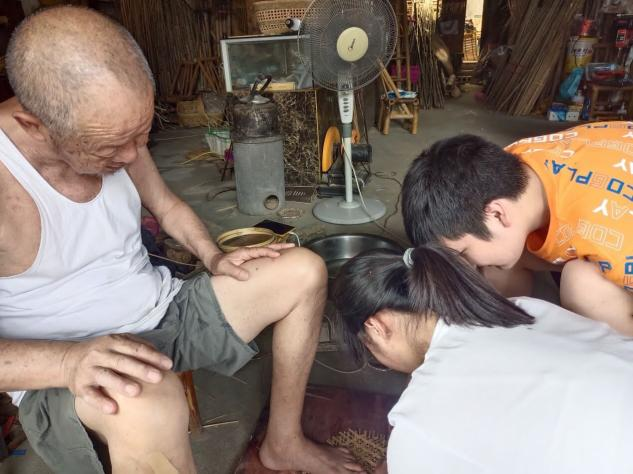 图为实践队员在陈正和先生的指导下动手操作,实际感受竹编技艺。通讯员朱雅婷摄