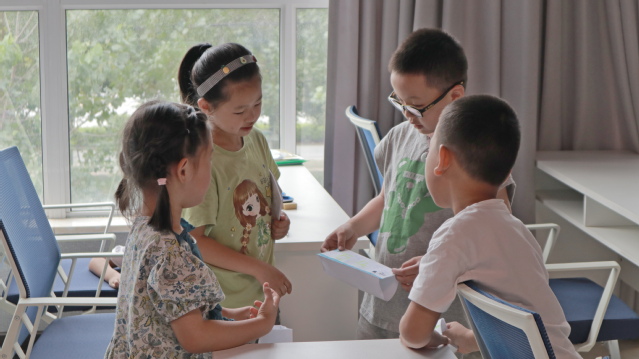 (图为下课后小朋友们用姓名牌相互认识。通讯员 马恒芳摄)