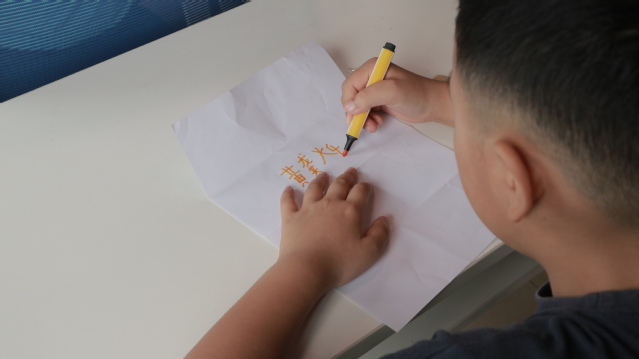 (图为小朋友们在姓名牌上一笔一划认真写下自己的名字。通讯员 马恒芳摄)