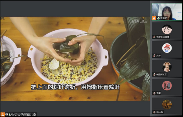 接着,志愿者张语姿还以一则短视频介绍粽子的制作方法。作为端午节纪念屈原的食物,不论是南方咸粽子还是北方甜粽子,都包裹着我们中国人浓浓的爱国心和对先辈的感恩呢!通讯员刘鼎怡提供
