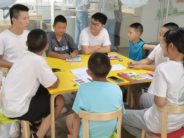 家长们与志愿者交流说明自家孩子的学习情况,志愿者们领着小朋友们自我介绍,开展破冰活动,目的在于让小朋友在正式授课前,相互熟悉,成为好朋友,让志愿者们与孩子们近距离的接触与磨合,促进彼此间逐渐产生信任和依赖感,让接下来三十天的授课活动变得更加顺利。志愿者们针对不同年龄段的孩子们用各种形式开展破冰活动,对于年龄稍大的小朋友们,志愿者们和他们围坐一桌,进行自我介绍和成语接龙游戏;对于年龄稍小的小朋友,志愿者与她们单独交流,用音乐和游戏拉进彼此之间的距离。