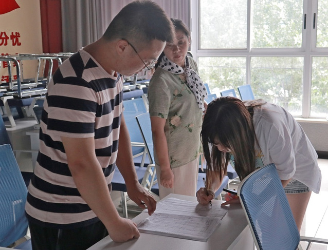 (图为志愿者引导家长填写学生信息登记表,并签署安全责任告知书。通讯员马恒芳摄)