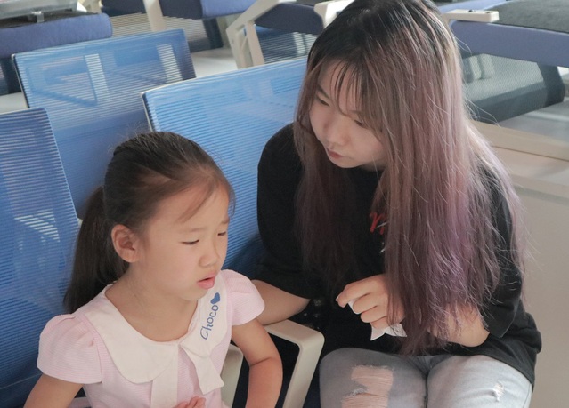 (图为志愿者安慰肚子疼的学生,并陪学生一起等待奶奶来接。通讯员马恒芳摄)