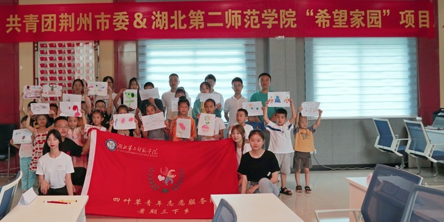 (图为荆州区“希望家园”负责人、五台村负责人、四叶草志愿服务队带队老师、小分队志愿者及学生们一起合影留念。 通讯员 马恒芳 摄)