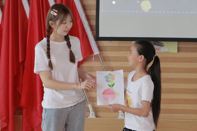 (图为学生向全班展示介绍自己的绘画作品,志愿者老师与学生相视而笑,露出了灿烂的笑容。通讯员马恒芳摄)
