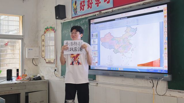 图为志愿者在地理课上为同学们讲解香港特别行政区