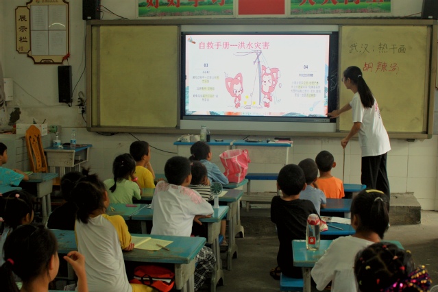 课上,志愿者郑素丽为孩子们讲述此次河南暴雨以及群众受灾状况、播放相关视频并展示照片,使远在山区的孩子们也了解到近期河南受灾事件。以此次事件为引入话题,志愿者为孩子们讲解在遭遇洪灾时所需要注意的事项和自救方法——“在遭遇洪灾时,我们应该果断撤离危险地带,并保持手机有电,能够联系上救援人员。”“一定要远离电线杆、电闸等带电设施,防止水导电并造成触电。”“灾后一定要清洗身体,防止感染......”