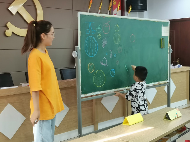 本网讯(通讯员 吴何玉)7月23日,我校四叶草青年志愿服务队第一分队来到了荆州市荆州区郢城镇茶庵寺社区党员群众活动中心,给茶庵寺的留守儿童开展简笔画等艺术课堂。其目的在于培养提高小朋友们的判断力、想象力、创造力,补齐当地儿童在艺术教育方面的缺失,鼓励学生对所学的艺术作品有独到的感受与见解,帮助学生建立起艺术与人生的密切联系,为终生学习和享受艺术奠定基础。青年志愿者王茹萱给孩子们教授了一节生动有趣的简笔画。通过在黑板上画一个圆让小朋友自行绘画,孩子们发挥的想象,绘画出了各式各样的简笔画图形。不断的搭建出孩子们对于艺术的态度,并从中萌发出对于绘画的创造力。