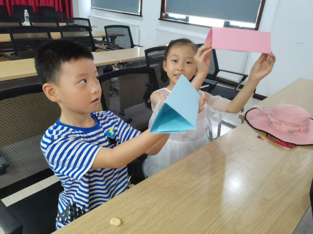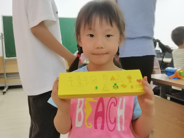 图为小朋友们展示自己刚刚制作好的姓名牌。通讯员吴何玉摄