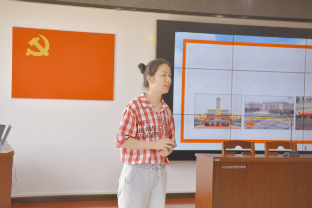 图为队员孟雪阳带领同学们复习建党节的相关知识。通讯员刘思豆摄