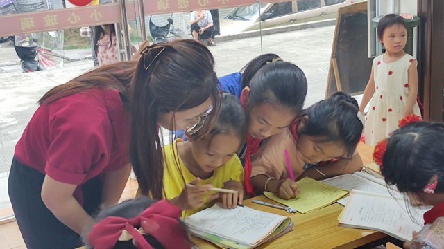 图为志愿者老师为学生指导学生完成作业。下午五点半,孩子们便急急忙忙拉着小伙伴,背上书包来到学习场地,当听说写完作业有游戏活动,孩子们个个都铆足了劲写作业。