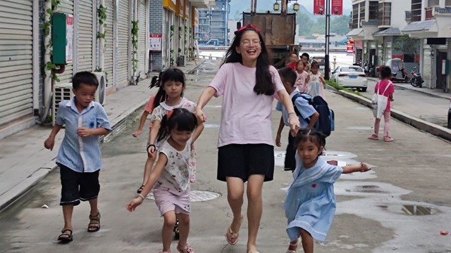 图为学生拉着志愿者老师挑选游戏场地。听说要找游戏场地,孩子们争着抢着拉志愿者老师找地方,纷纷把自己最喜欢的地方介绍给老师。
