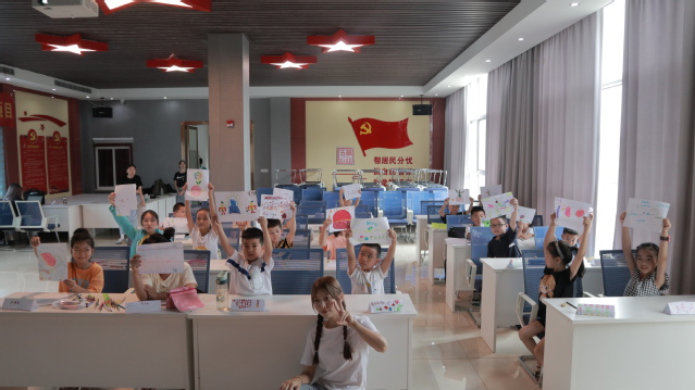 图为绘画课上小朋友们举起自己的绘画作品和志愿者老师大合照。通讯员 马恒芳摄