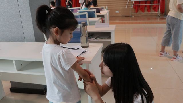 图为小朋友手臂擦伤志愿者及时安抚并给小朋友消毒。通讯员 马恒芳摄