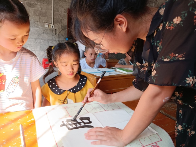 图为志愿者老师正在耐心为小朋友示范如何练习毛笔字。