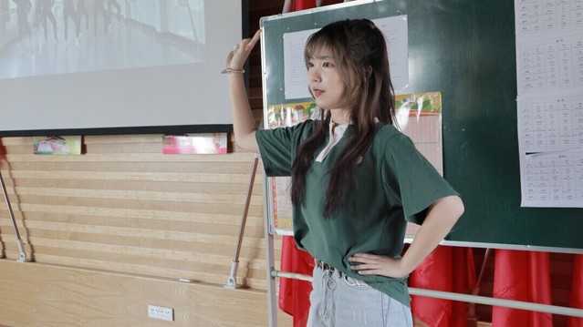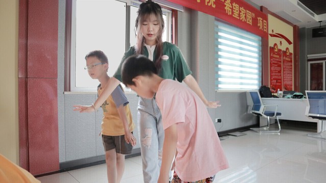 图为志愿者在实施正式教学之前,给孩子们完整展示舞蹈,让他们对动作形成粗略印象,便于后续教学。通讯员 贾云霞 摄