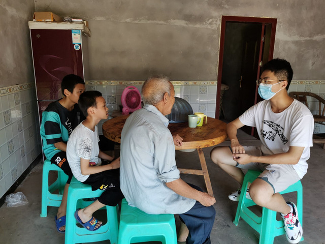 图为志愿者去学生家里进行家访,通过学生的爷爷了解学生的家庭情况。通讯员 刘家杰 摄
