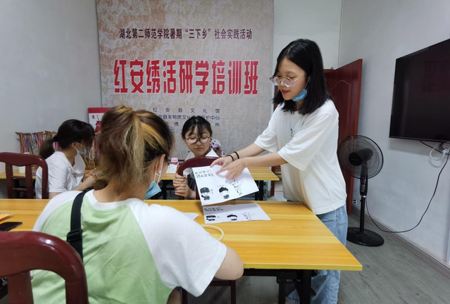 图为志愿者在红安绣活传习所相互讨论自己准备选用的图案。通讯员 温洪胤 摄