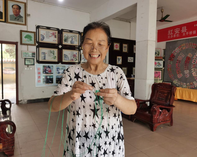 图为民间绣活传承人刘寿仙帮助志愿者整理线头。通讯员温洪胤摄