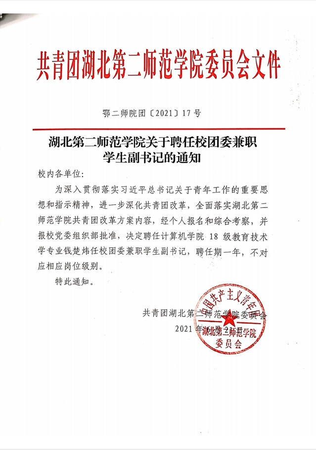 湖北第二师范学院关于聘任校团委兼职副书记的通知