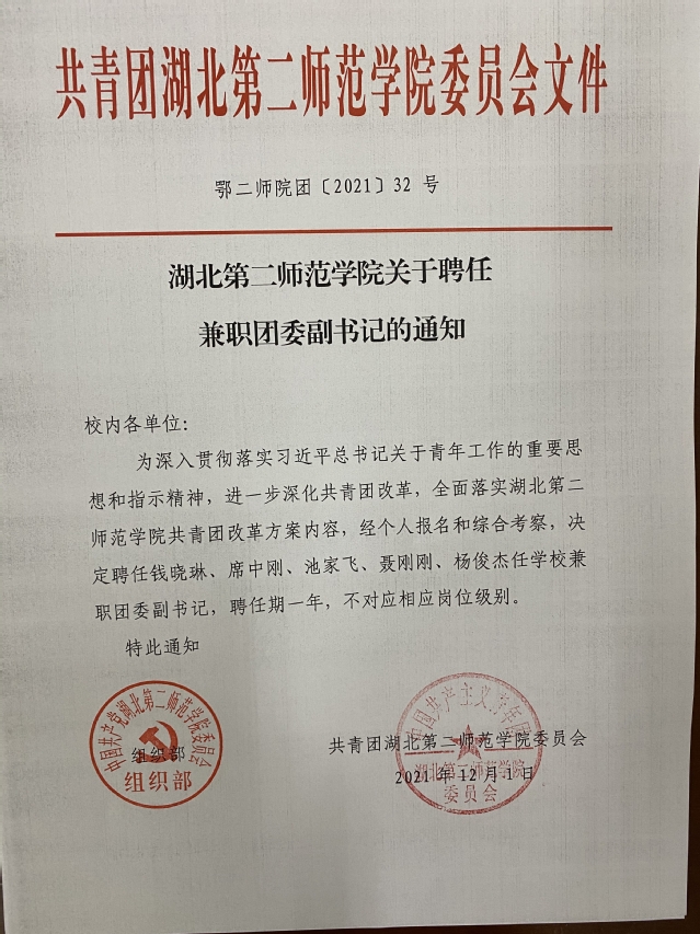 湖北第二师范学院关于聘任兼职团委副书记的通知