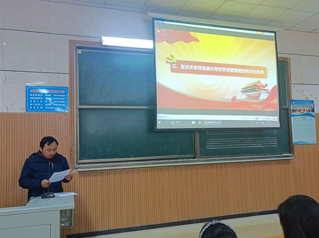 宦忠虎宣读了化生院本届分党校学员管理规定和评优条例,并期望入党积极分子们以后可以遵守管理规定,争取在课程结束后成为一名优秀的预备党员。