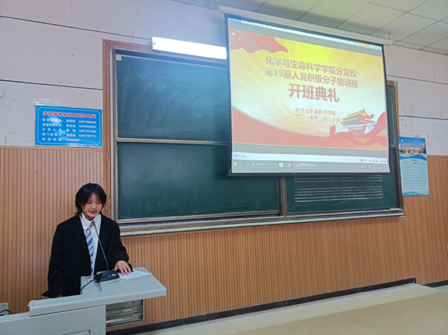 本网讯(通讯员 贾佩瑶)12月20日中午12时30分,我校化学与生命科学学院(以下简称“化生院”)第十九期入党积极分子培训班开班典礼(以下简称“开班典礼”)于阶梯教室4顺利展开。开班典礼由秦姗姗主持,参会领导有化生院党委副书记雷晓林、化生院组织员李立、化生院分团委书记宦忠虎、化生院学生党支部书记高丽娥、化生院分团委副书记邱梦莹,参会人员有第十九届入党积极分子培训班全体人员。