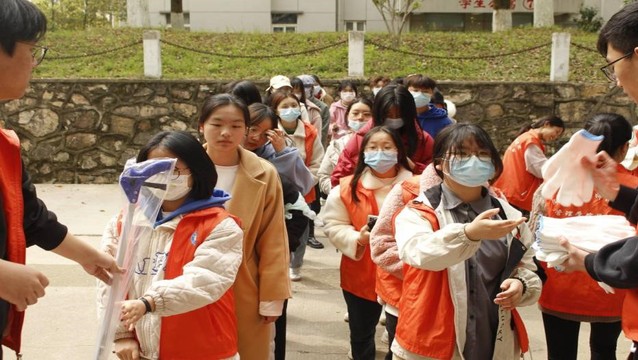 (图为给同学们分发劳动工具)