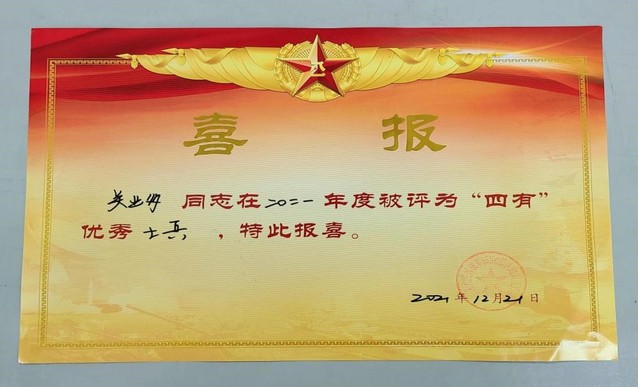 本网讯(通讯员 严雯)日前,我校收到解放军南部战区空军某部专项发来喜报,我校管理学院2016级市场营销专业参军入伍学生关业多被部队评为2021年度“四有”优秀士兵。