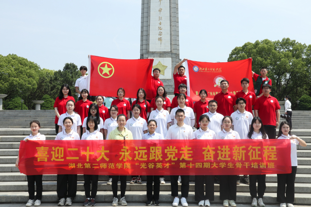 本网讯(青媒见习记者 孔瑶婷)5月21日上午,我校“青马工程”第十四期“光谷英才”大学生骨干培训班“喜迎二十大,永远跟党走,奋进新征程”红色教育活动于湖北省革命老区红安县顺利开展。校团委书记文敏,校团委指导老师张静、杨俊杰以及培训班全体成员参与。