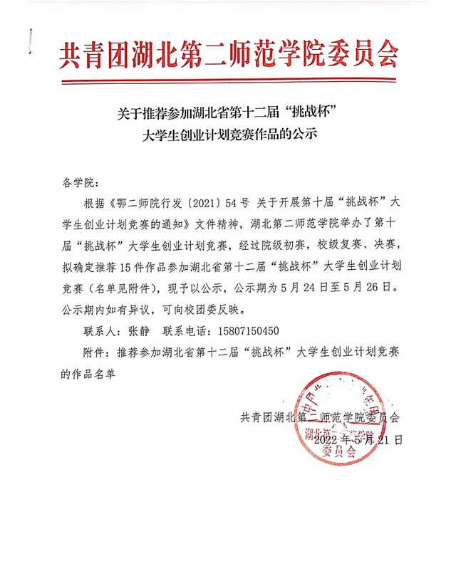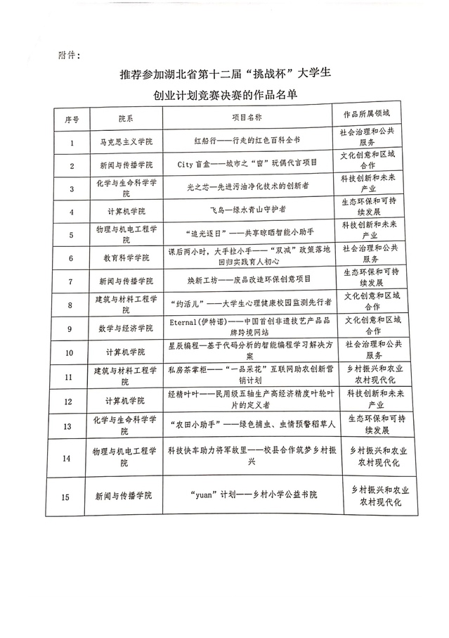 关于推荐参加湖北省第十二届“挑战杯”大学生创业计划竞赛作品的公示