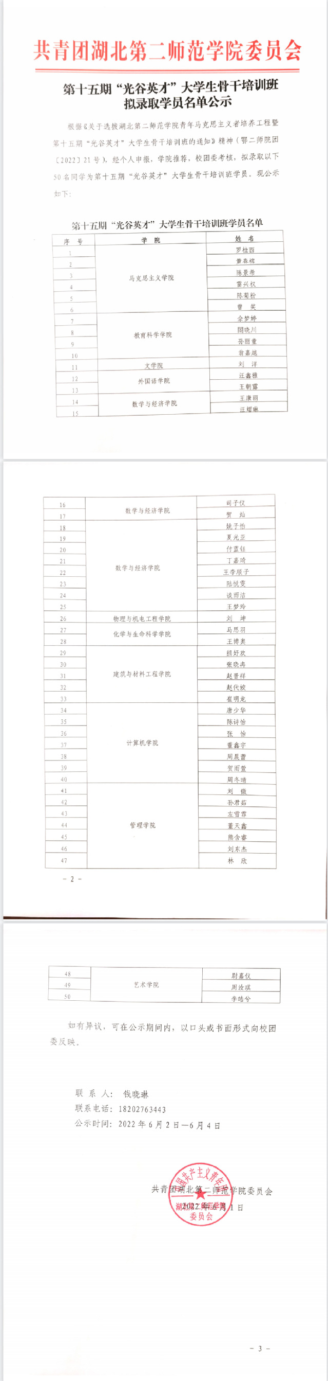 第十五期“光谷英才”大学生骨干培训班拟录取学员名单公示