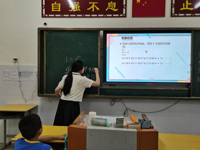 (图为志愿者在黑板上写下有关乐谱的知识)