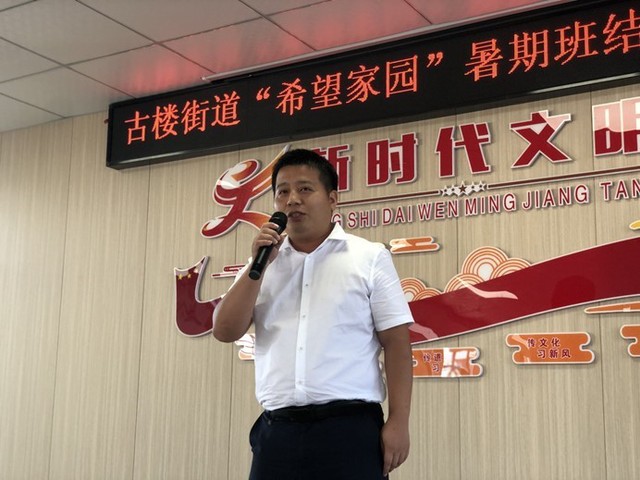 活动伊始,鄂州古楼街道团工委负责人彭学业发表讲话。彭学业对本次“希望家园”的基本情况进行汇报。他介绍到,2022年“希望家园”活动历时17天,经鄂州团市委组织,来自星野志愿服务队的志愿者们在濠塘、考棚、镜园、和贵园四个社区开办暑期班,为古楼街道80余名双职工家庭儿童、留守儿童带去90余节课,其中除了趣味剪纸、趣味体育等传统课外拓展科目之外,还包括机场户外实践、安全知识讲座、爱党主题教育、普通话推广等10余节特色活动课。