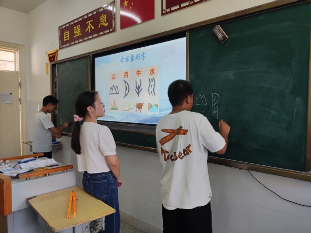 (图为学生正在黑板上学写象形字,志愿者在一旁指导)