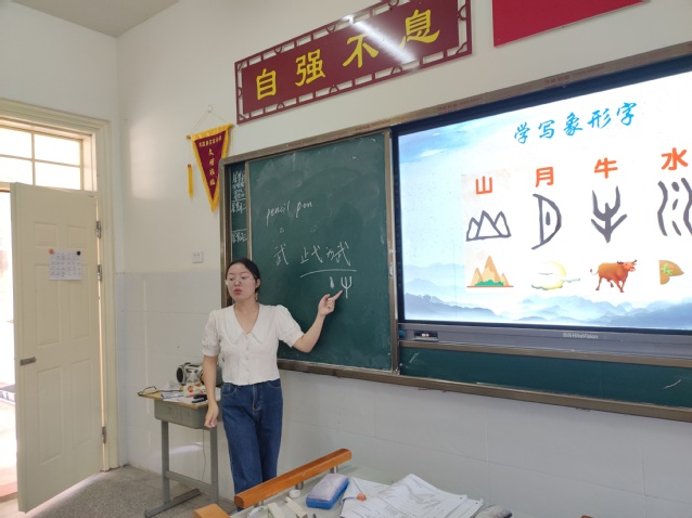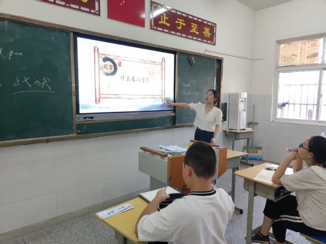本网讯(通讯员 刘芷晴)汉字是记录事件的工具,是汉民族的文化瑰宝,更是民族灵魂的纽带。7月25日上午,我校四叶草青年志愿服务队于孝感市孝昌县实验中学开展了一堂别开生面的书法课。课堂上,志愿者讲述汉字的起源、汉字的演变以及汉字的功能作用,同时,志愿者带领学生学习书写象形字,感受汉字的文化魅力。