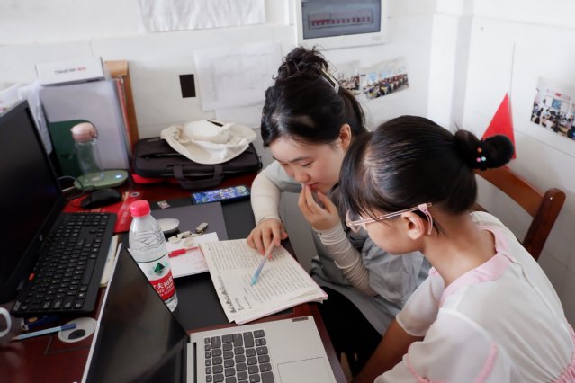 图为小课间时,认真学习的孩子来到办公室,向志愿者老师们礼貌地提出自己百思不得其解的作业难题