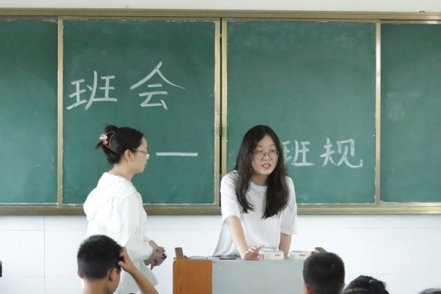 图为四叶草青年志愿服务队联合孝昌县卫店镇中心小学开展暑期活动一周左右,展开多次集体讨论会议、民主地采纳孩子们的建议,一起制定班规的场景