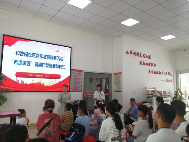 在孩子们的热情期待和家长的积极支持下,开幕仪式圆满进行,贵和园社区的书记向我们介绍了凤凰街道的历史,她是一座有着丰富深厚底蕴的人文历史街道。而今年,鄂州市开展暑期“希望家园”行动,这既是共青团开展关爱留守少年儿童的一次具体行动,也是社会各界关爱留守少年儿童的重要体现,书记向我们志愿者们报以热切期待,她说:“少年儿童是家庭的希望,也是祖国的未来和民族的希望。关注青少年弱势群体、关爱留守少年儿童成长、关心贫困家庭,这是全社会每个公民义不容辞的光荣职责,也是构建和谐社会的具体表现。让我们把爱心献给每一个孩子、把真情送给每一个儿童、把温暖带给每一个贫困家庭。让留守少年儿童与同龄伙伴一起沐浴在爱的阳光下,茁壮成长为新一代传播爱心的使者。”是呀,借用习近平总书记的一段话,与各位共勉。“后生可畏,焉知来者之不如今也?”青年之于党和国家而言,最值得爱护、最值得期待。青年犹如大地上茁壮成长的小树,总有一天会长成参天大树,撑起一片天。青年又如初升的朝阳,不断积聚着能量,总有一刻会把光和热洒满大地。