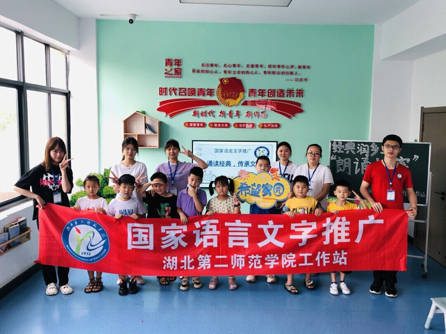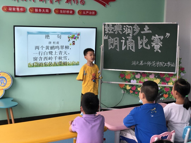 对于这小小的城市,天真的孩童,我们并不只是匆匆的过客。我们是这些孩子们假期中的老师,予他们人生一课。为了能够丰富孩子们的课堂,培养孩子们的兴趣爱好,队员们响应国家文字推广的需求,利用周末闲暇的时光,设计了“经典润乡土”的朗诵比赛,大家精心挑选适合暑期班里所有孩子的课文选段、诗词歌赋,将文本中的精神内核与趣味故事教授给孩子们,让孩子们去尝试朗读、背诵。在前期的准备中,孩子们收获了有趣的知识,领略了神奇的文本句子,得见中华语言文字的绚丽与奇妙。