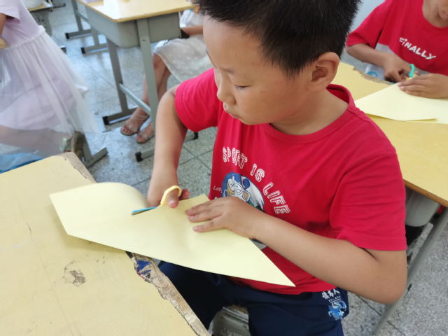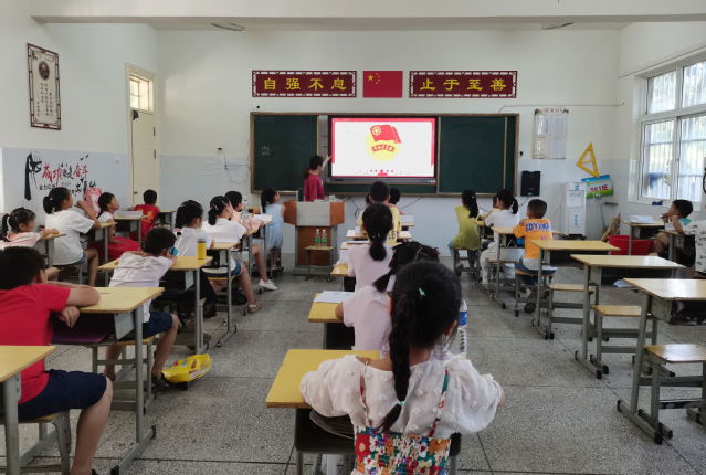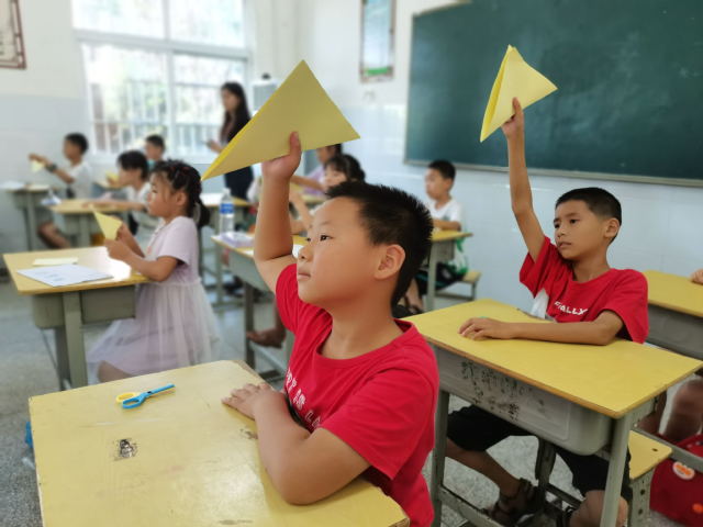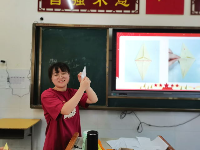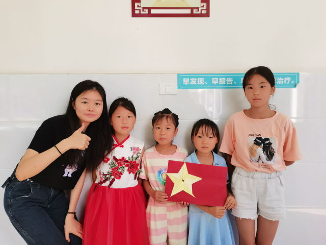 本网讯(通讯员 陈安琪)五角星闪耀的光,是我们青年学子矢志不渝追随的光,7月25日,我校四叶草青年志愿服务队在孝昌县实验中学为小朋友们带来了一堂党旗专题课,志愿者为小朋友们详细讲解党旗的构成,教小朋友们折五角星,小朋友们积极完成五角星折叠的学习,还和身边的人一起分享自己折叠的五角星,在这一堂课中,他们的笑容和手中的五角星一样闪耀。