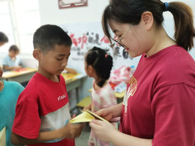 图为四叶草青年志愿服务队队员为小朋友们演示折叠的方法