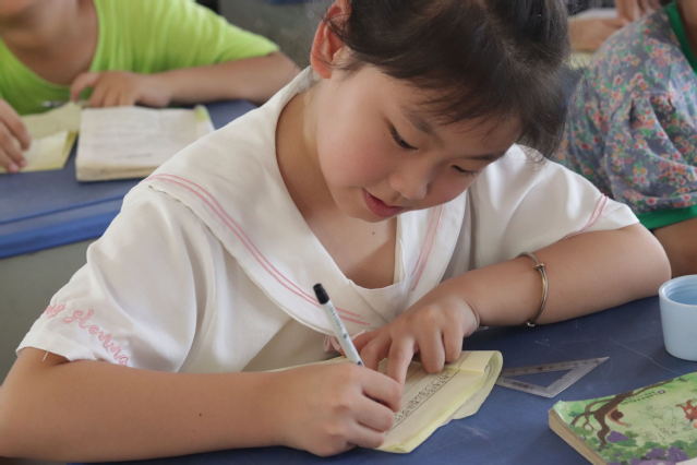 图为小朋友认真地在自己的写作本上写下自己充满想象力的回答
