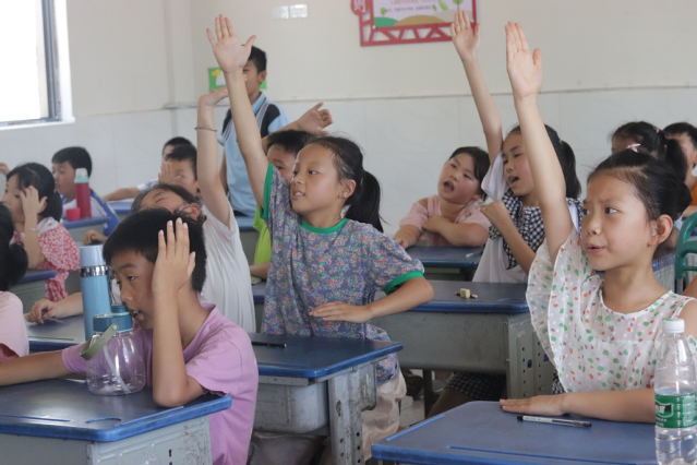 图为上课时小朋友积极举手回答志愿者老师的提问