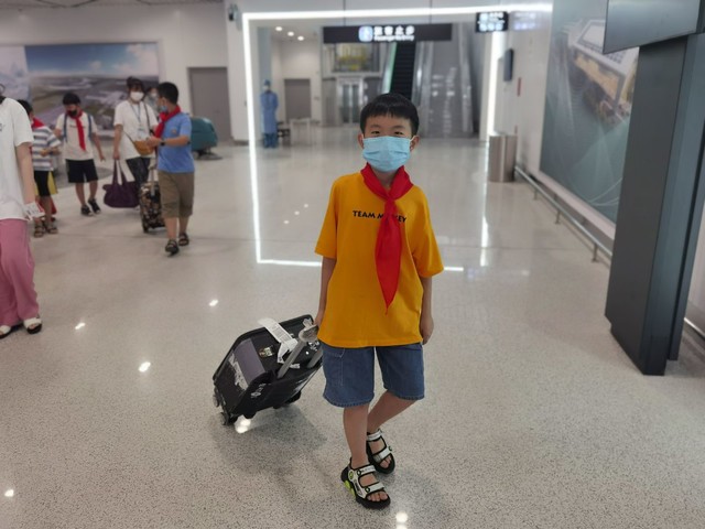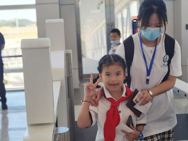 “你看,这是我的登机牌,是飞往北京的。”小朋友们戴着鲜艳的红领巾,举起手中的登机牌,稚嫩的脸上绽放着灿烂的笑容。