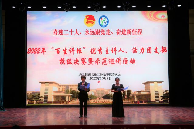本网讯(青媒见习记者 杨思琪 赵荷婷)10月7日晚,我校2022年度“百生讲坛”优秀主讲人、活力团支部校级决赛暨示范巡讲活动在大礼堂举行。学工部、人民武装部部长文敏,马克思主义学院副院长蔡志荣教授,教育科学学院刘晶晶副教授,各学院分党委(党总支)副书记出席本次活动。