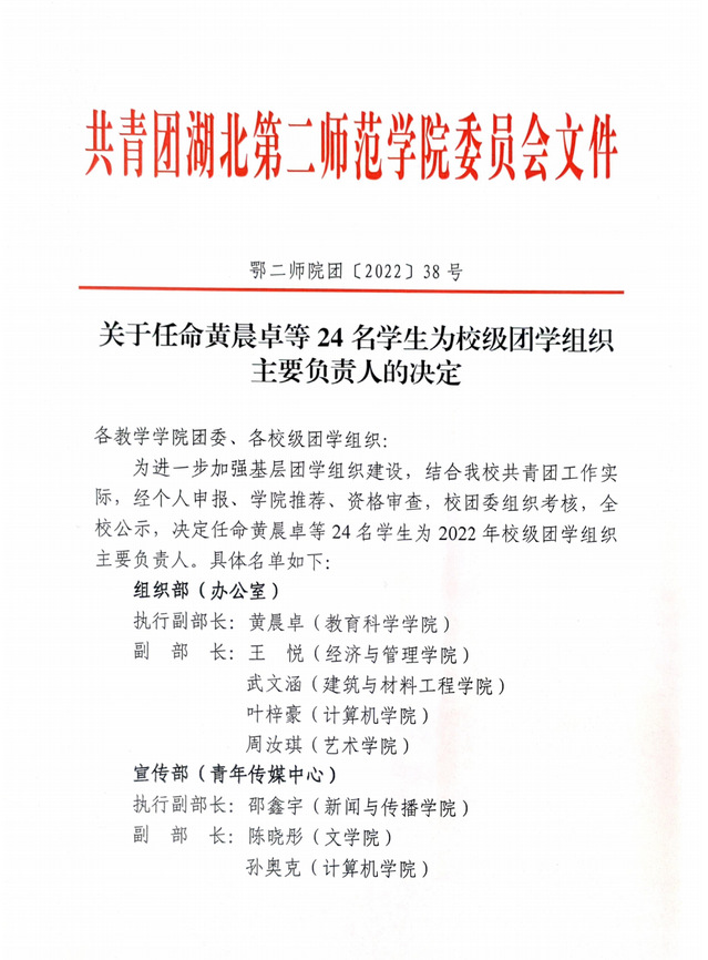 湖北第二师范学院关于任命校级团学组织主要负责人的通知